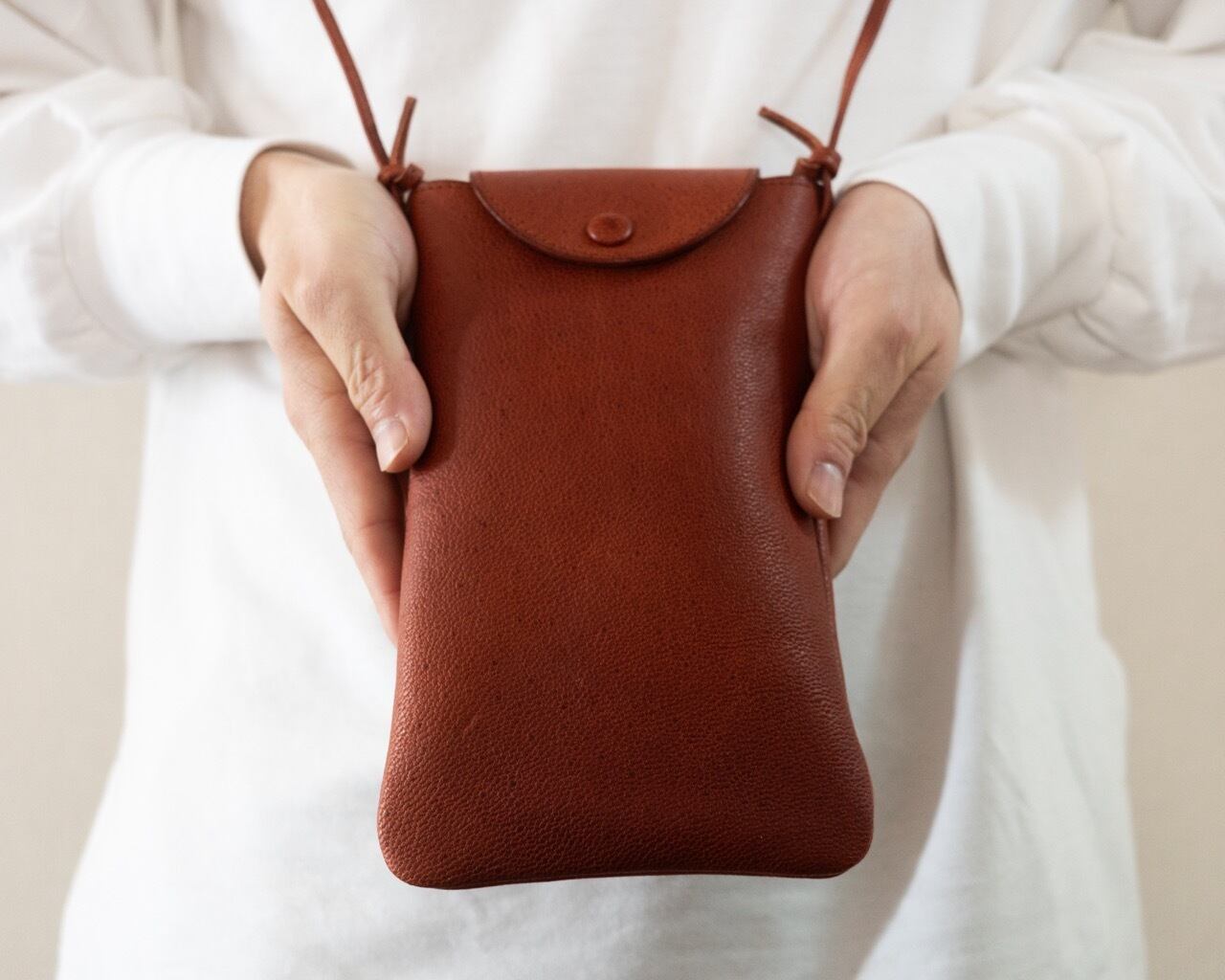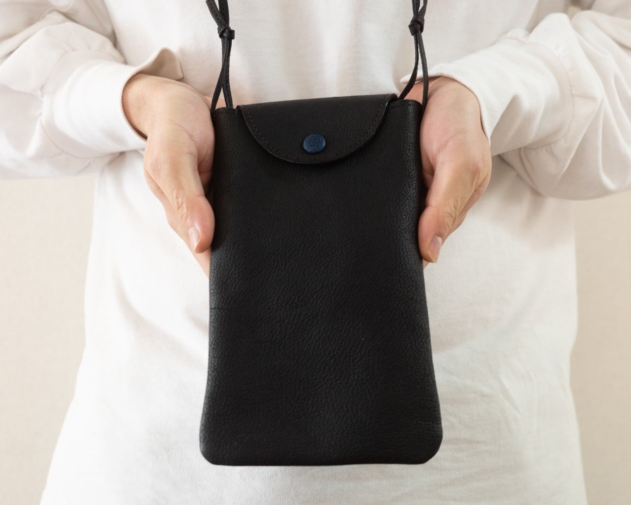 「熊耳ポーチ」と名付けているのは、紐が通されているポーチのサイド部分の名称を「熊耳」と呼んで製品開発していたからです。スマホやお財布などちょっとした小物をいれてお出かけするのに適したサイズ感です。紐の長さは自由に変えられるので、体型や好みに合わせてお使いいただけます。